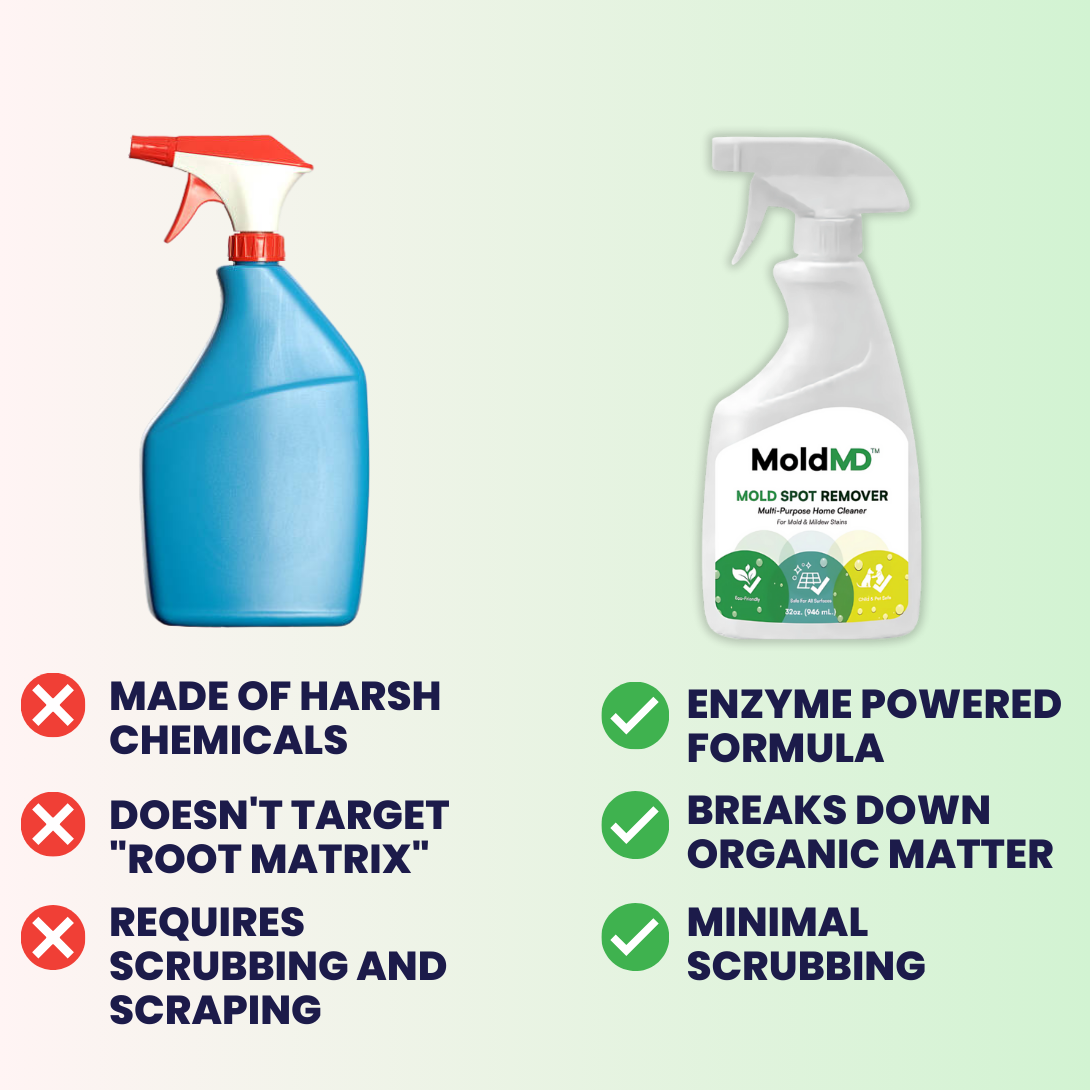 Because MoldMD is enzyme based, there are no chemical fumes, no toxic residues, and no scary hazard labels. You can spray with confidence, even in kitchens, kids’ rooms, and pet areas.
